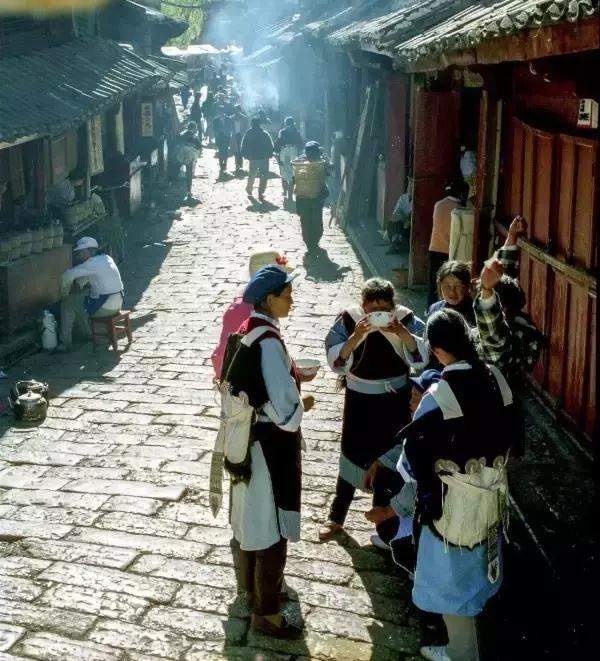 青石板砌成的街道上,还没有那么大的人流,穿着传统服饰的纳西妇女站在街边吃着早餐。20年前的大研古镇,连清晨的阳光也是如此宁静。
